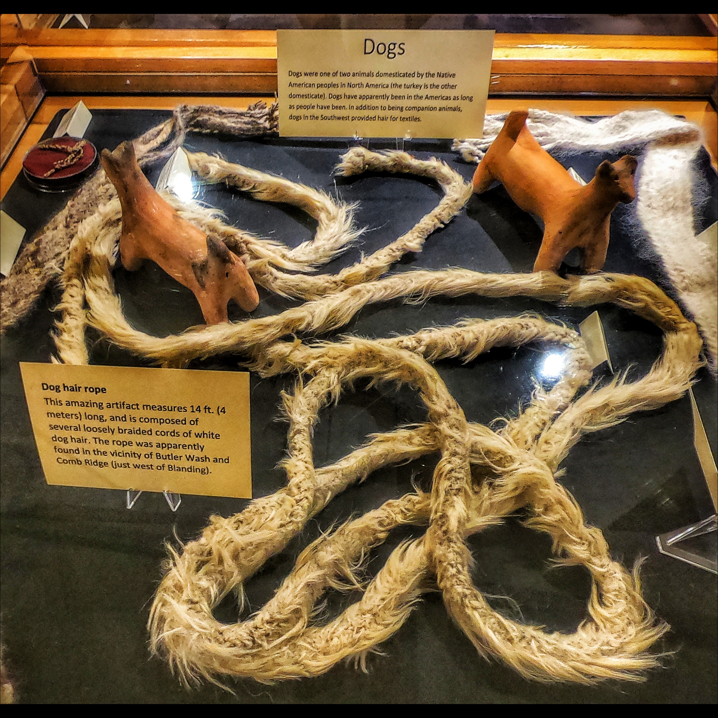 Ancestral Hopi depictions of canines (Poko) and other dog-like animals, such as coyotes (Iisaw), foxes (Taayo) and wolves (Kweewu) is found within the archaeological record, sometimes as petroglyphs depicting paw prints or the animal journeying along a path. There is also evidence that dogs were providing weaving material from their fur, with indications that long-haired dogs were specifically bred for this purpose.